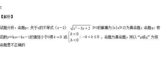 ≥0的解集为{x|x≥2},命题q:若函数y=kx2-kx-1的值恒小于0,则-4<k≤0,那么不正确的是( )