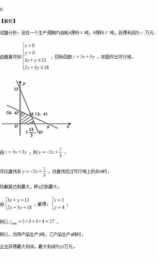某企业生产甲、乙两种产品,已知生产每吨甲产品要用A原料3吨、B原料2吨;生产每吨乙产品要用A原料1吨、B原料3吨.销售每吨甲产品可获得利润5万元,每吨乙产品可获得利润3万元,该企业在一个生产周期内消耗A原料不超过13吨,B原料不超过18吨,那么该企业可获得最大利润是( )