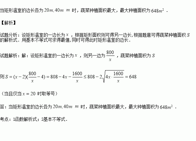 宽的空地,当矩形温室的边长各为多少时,蔬菜的种植面积最大?最大种植面积是多少?