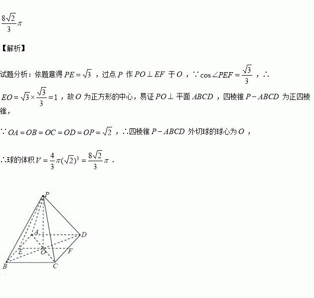 如图所示,在四棱锥中,底面是边长为的正方形,是正三角形,分别是的中点,,若在同一球面上,则此球的体积为____.