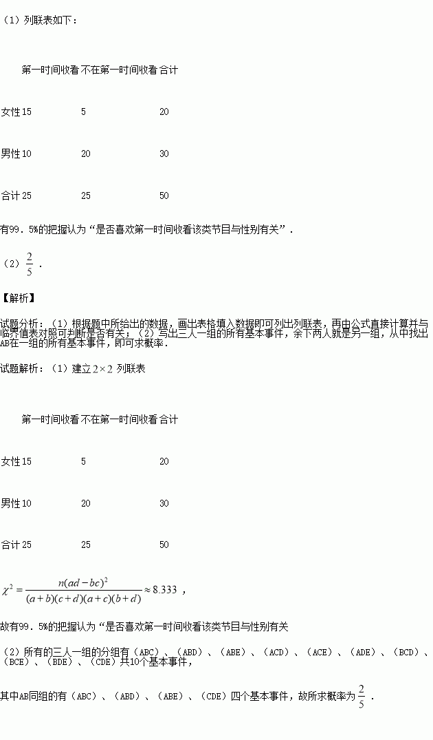 近两年来,各大电视台都推出了由明星参与的游戏竞技类节目。高一某研究性学习小组在长沙某社区对50人进行第一时间收看该类节目与性别是否有关的收视调查,其中20名女性中有15名第一时间收看该类节目,30名男性中10名第一时间收看该类节目.