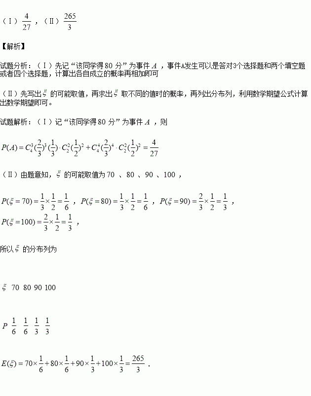 一次测验共有4个选择题和2个填空题,每答对一个选择题得20分,每答对一个填空题得10分,答错或不答得0分,若某同学答对每个选择题的概率均为