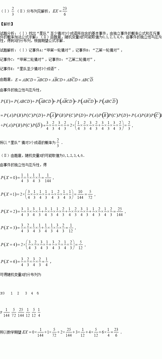 ¼×¡¢ÒÒÁ½ÈË×é³É¡°ÐǶӡ±²Î¼Ó²Â³ÉÓï»î¶¯£¬Ã¿ÂֻÓɼס¢ÒÒ¸÷²ÂÒ»¸ö³ÉÓÔÚÒ»ÂֻÖУ¬Èç¹ûÁ½È˶¼²Â¶Ô£¬Ôò¡°ÐǶӡ±µÃ3·Ö£»Èç¹ûÖ»ÓÐÒ»¸öÈ˲¶ԣ¬Ôò¡°ÐǶӡ±µÃ1·Ö£»Èç¹ûÁ½È˶¼Ã»²Â¶Ô£¬Ôò¡°ÐǶӡ±µÃ0·Ö¡£ÒÑÖª¼×ÿÂֲ¶ԵĸÅÂÊÊÇ