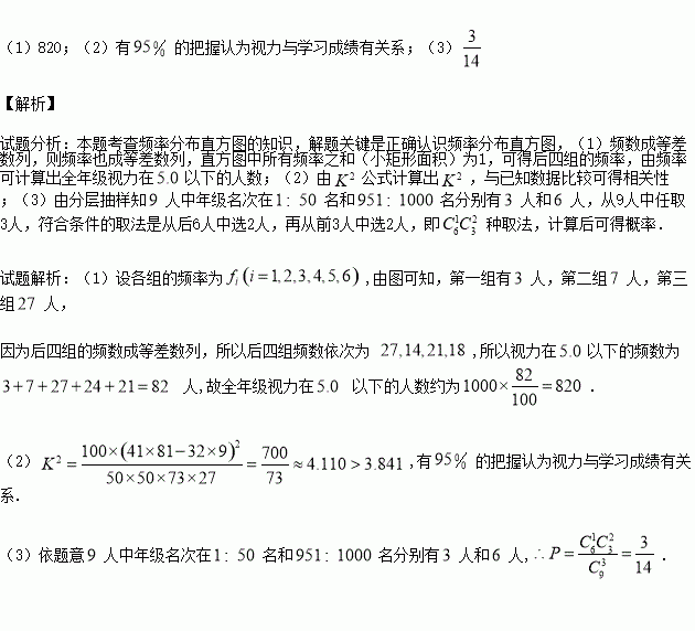 (2)学习小组成员发现,学习成绩突出的学生,近视的比较多,为了研究学生的视力与学习成绩是否有关系,对年级名次在