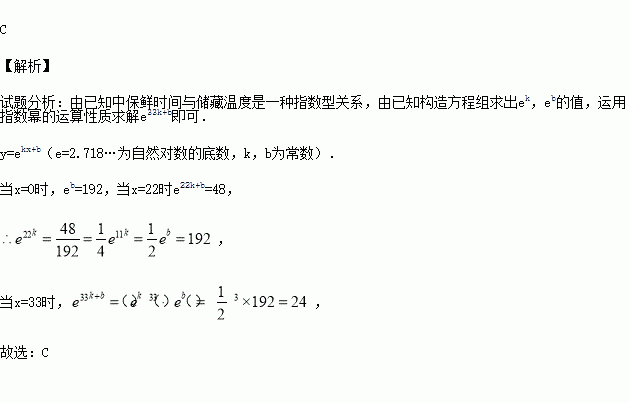 为常数).若该食品在0℃的保鲜时间是192小时,在22℃的保鲜时间是48小时,则该食品在33℃的保鲜时间是( )