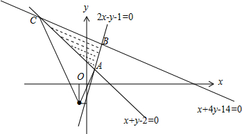 解答 解:由约束条件$\left\{\begin{array}{l}{x+y-2≥0}\\{2x-y-1≤0}\\{x+4y-14≤0}\end{array}\right.$作出可行域如图,![]()