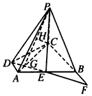 | 解:如图, (1)设AC与DE交于点G,延长DE交CB的延长线于点F, 则易得△DAE≌△FBE, ∴BF=AD=1,∴CF=4, ∴ 又∵ ∴∠BFE=∠ACD, 又∵∠ACD+∠ACF=90°, ∴∠BFE+∠ACF=90°, ∴∠CGF=90°,∴AC⊥DE, 又∵PC⊥底面ABCD, ∴PC⊥DE, ∴DE⊥平面PAC, ∵DE ∴平面PDE⊥平面PAC。 (2)连接PG,过点C作CH⊥PG于H点, 则由(1)知平面PDE⊥平面PAC,且PG是交线, 根据面面垂直的性质,得CH⊥平面PDE, 从而∠CPH,即∠CPG为直线PC与平面PDE所成的角, 在Rt△DCA中, 在Rt△PCG中, 所以 (3)由 点C到平面PDE的距离的 在Rt△PCG中, 从而点B到平面PDE的距离等于 |