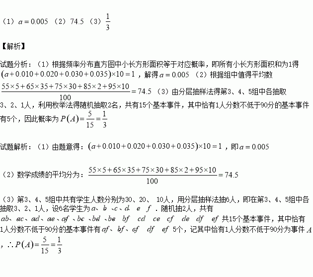 (3)现用分层抽样的方法从第3、4、5组中随机抽取6名学生,将该样本看成一个总体,从中随机抽取2名,求其中恰有1人的分数不低于90分的概率?