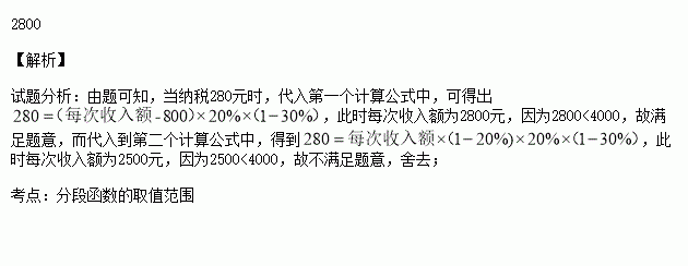 (1)每次收入不超过4000元的:应纳税额=(每次收入额-800)×20%×(1-30%)