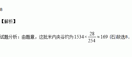 我国古代数学名著《数书九章》有“米谷粒分”题:粮仓开仓收粮,有人送来米1534石,验得米内夹谷,抽样取米一把,数得254粒内夹谷28粒,则这批米内夹谷约为