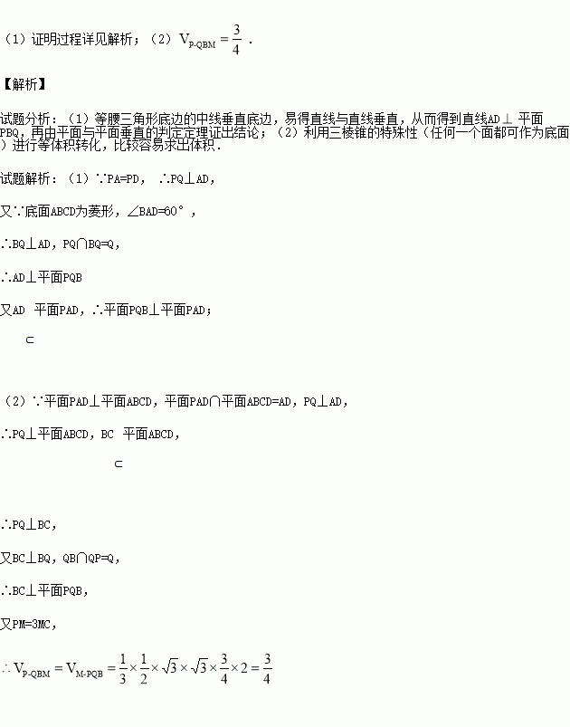 (2)若平面PAD⊥平面ABCD,且PA=PD=AD=2,点M在线段PC上,且PM=3MC,求三棱锥P﹣QBM的体积.