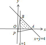 联立$\left\{\begin{array}{l}{x=1}\\{x+y=4}\end{array}\right.$,得B(1,3),