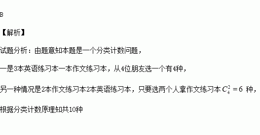 老师有同样的作文练习2本,同样的英语练习3本,从中取出4本送给4位学生,每位学生1本,则不同的送法共有( )