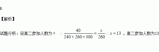 某学校高中部组织赴美游学活动,其中高一240人,高二260人,高三300人,现需按年级抽样分配参加名额40人,高二参加人数为