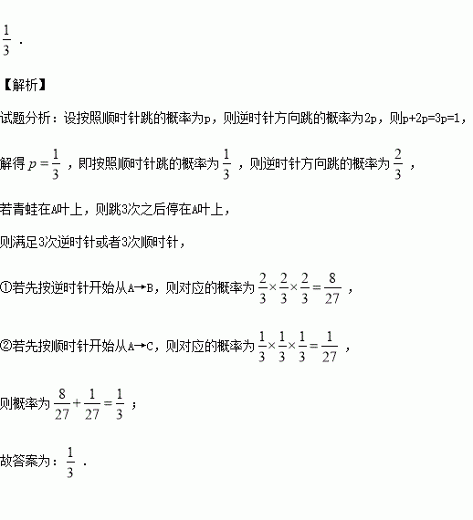 荷花池中,有一只青蛙在成品字形的三片荷叶上跳来跳去(每次跳跃时,均从一叶跳到另一叶),而且逆时针方向跳的概率是顺时针方向跳的概率的两倍,如图所示,假设现在青蛙在A叶上,则跳三次之后停在A叶上的概率是________.