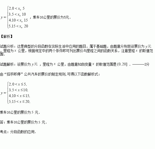 若某条线路的总里程为20公里,写出票价与里程之间的函数关系式,并求乘车16公里的票价.