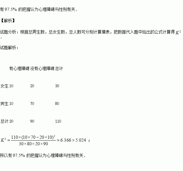 将表格填写完整,试说明心理障碍与性别的关系?![]()