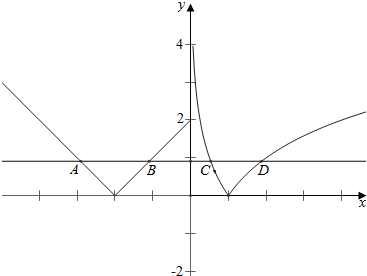 解答 解:作函数$f(x)=\left\{\begin{array}{l}|{x+2}|,\;\;\;x≤0\\|{lo{g_2}x}|,\;\;x>0\end{array}\right.$的图象如下,