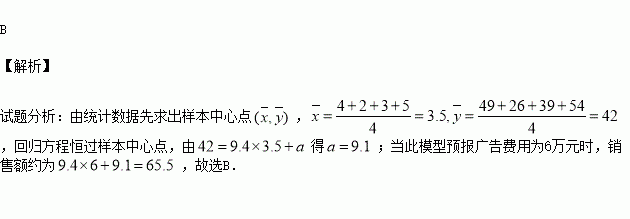 根据上表可得回归方程y=bx+a中的b为9.4,据此模型预报广告费用为6万元时,销售额约为( )