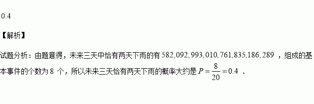 天气预报说,未来三天每天下雨的概率都是0.6,用1、2、3、4表示不下雨,用5、6、7、8、9、0表示下雨,利用计算机生成下列20组随机数,则未来三天恰有两天下雨的概率大约是 .
