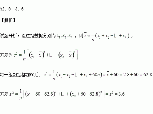 一组数据的平均数是2.8,方差是3.6,若将这组数据中的每一个数据都加上60,得 到一组新的数据,则所得的新数据的平均数和方差分别是__________.