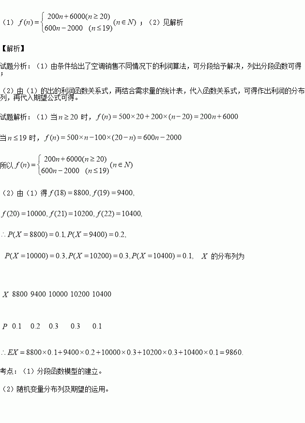 以10周记录的各需求量的频率作为各需求量发生的概率,若商场周初购进20台空调器,X表示当周的利润(单位:元),求X的分布列及数学期望。