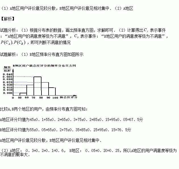 地区用户满意度评分的频率分布直方图,并通过此图比较两地区满意度评分的平均值及分散程度(不要求计算出具体值,给出结论即可)