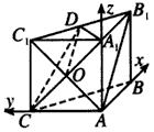 | (2)连接AC1,交A1C于点O,连接OD,如图, 因为四边形ACC1A1为正方形,所以O为AC1的中点, 又D为B1C1的中点, 所以OD为△AB1C1的中位线, 所以AB1∥OD, 因为OD 所以AB1∥平面A1DC。 (3)因为侧面ABB1A1,ACC1A1均为正方形,∠BAC=90°, 所以AB,AC,AA1两两互相垂直,建立如图所示的空间直角坐标系A-xyz, 设AB=1,则C(0,1,0),B(1,0,0),A1(0,0,1), 设平面A1DC的一个法向量为n=(x,y,z), 则 取x=1,得n=(1,-1,-1), 又因为AB⊥平面ACC1A1, 所以平面ACC1A1的一个法向量为 因为二面角D-A1C-A是钝二面角, 所以,二面角D-A1C-A的余弦值为 |