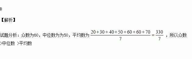 已知一组数据为20、30、40、50、60、60、70,则这组数据的众数、中位数、平均数的大小关系为( )
