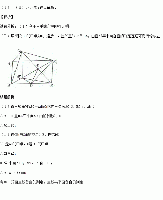 (本题满分12分)如下图所示:在直三棱柱ABC—A1B1C1中,AC=3,BC=4,AB=5,AA1=4,点D是AB的中点.