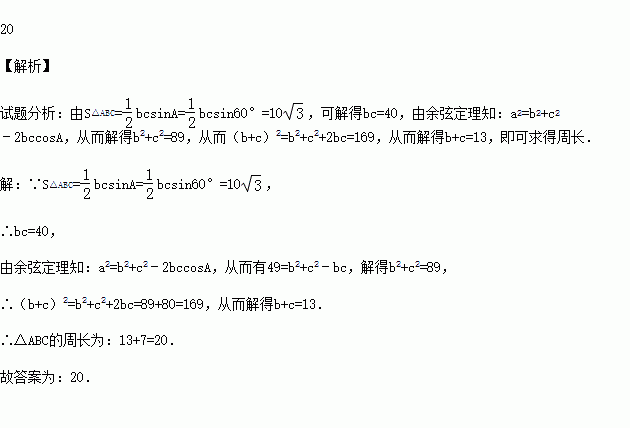 (2015秋•上海月考)已知a、b、c是△ABC中∠A、∠B、∠C的对边,若a=7,A=60°,△ABC的面积为10