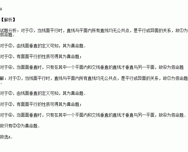 (2009•东城区二模)已知直线a和两个平面α,β,给出下列四个命题:①若a∥α,则α内的任何直线都与a平行;②若a⊥α,则α内的任何直线都与a垂直;③若α∥β,则β内的任何直线都与α平行;④若α⊥β,则β内的任何直线都与α垂直.则其中( )