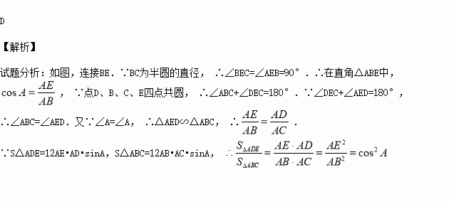 如图,锐角三角形ABC中,以BC的直径的半圆分别交AB,AC于点D,E,则⊿ADE的面积与⊿ABC的面积的比值是( )