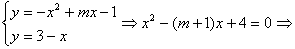 解:(1)集合A表示抛物线上的点,抛物线y=-x2+mx-1,开口向下且过点(0,-1)。集合B表示线段上的点,要使A∩B只有一个元素,则线段与抛物线的位置关系有以下两种,如图: 由图1知,在函数f(x)=-x2+mx-1中,只要 f(3)≥0即可,即由图2知,抛物线与直线在x∈[0,3]上相切,即Δ=(m+1)2-16=0∴m=3或m=-5,当m=3时,切点(2,1)适合,当m=-5时,切点(-2,5)舍去∴m=3或。