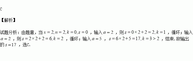 中国古代有计算多项式值得秦九韶算法,右图是实现该算法的程序框图.执行该程序框图,若输入的a为2,2,5,则输出的s=( )