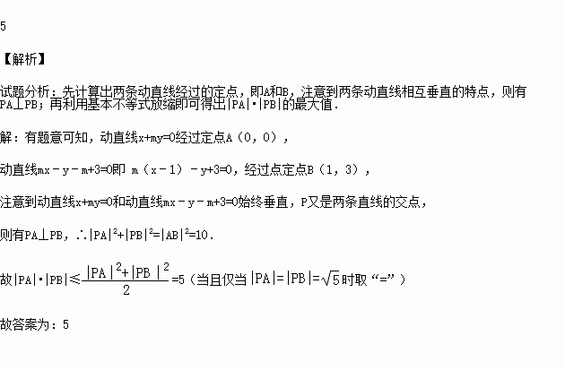 (2014•四川)设m∈R,过定点A的动直线x+my=0和过定点B的动直线mx﹣y﹣m+3=0交于点P(x,y).则|PA|•|PB|的最大值是 .
