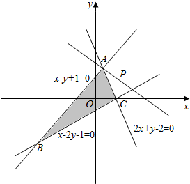 解方程组$\left\{\begin{array}{l}{x-y+1=0}\\{2x+y-2=0}\end{array}\right.$得x=$\frac{1}{3}$,y=$\frac{4}{3}$.