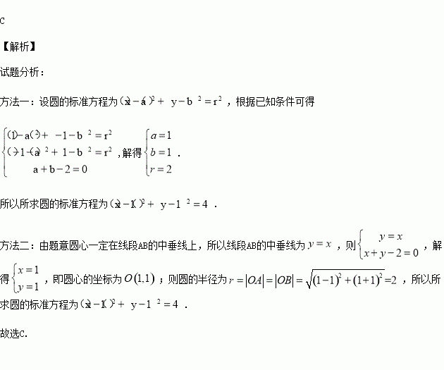 过点A(1,-1)、B(-1,1)且圆心在直线x+y-2=0上的圆的方程是( )