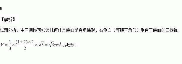 若某几何体的三视图(单位:cm)如图所示,其中左视图是一个边长为2的正三角形,则这个几何体的体积是( )