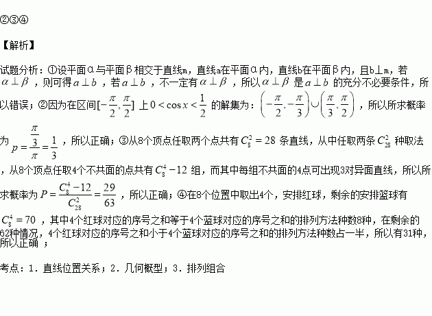 ④将4个相同的红球和4个相同的篮球排成一排,从左到右每个球依次对应的序号为1,2,3,…,8,若同色球之间不加区分,则4个红球对应的序号之和小于4个蓝球对应的序号之和的排列方法种数为31.