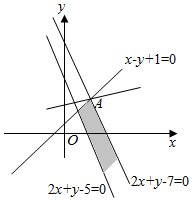 解:由约束条件$\left\{\begin{array}{l}{x-y+1≥0}\\{2x+y-7≤0}\\{2x+y-5≥0}\end{array}\right.$作出可行域如图,