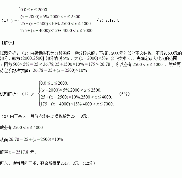(本小题满分12分)《中华人民共和国个人所得税》规定,公民全月工资、薪金所得不超过2000元的部分不必纳税,超过2000元的部分为全月应纳税所得额,此项税款按下表分段累计计算: