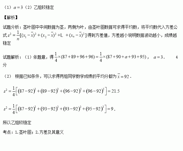 (2)求甲、乙两个小组数学成绩的方差,并说明哪个小组的成绩相对比较稳定;