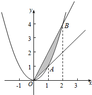 由$\left\{\begin{array}{l}{y={x}^{2}}\\{y=x}\end{array}\right.$,得A(1,1),又由$\left\{\begin{array}{l}{y={x}^{2}}\\{y=2x}\end{array}\right.$,得B(2,4),
