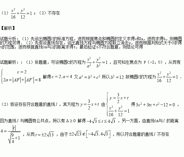(2)是否存在平行于OA的直线l,使得直线l与椭圆C有公共点,且直线OA与l的距离等于4?若存在求出直线方程;若不存在说明理由。