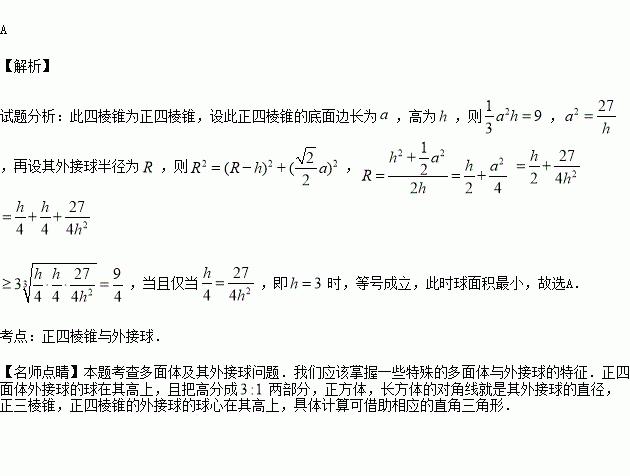 若一个四棱锥底面为正方形,顶点在底面的射影为正方形的中心,且该四棱锥的体积为9,当其外接球表面积最小时,它的高为( )