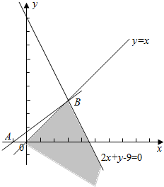 解:作出约束条件$\left\{\begin{array}{l}{x≥0}\\{y≤x}\\{2x+y-9≤0}\end{array}\right.$所对应的可行域D(如图阴影),