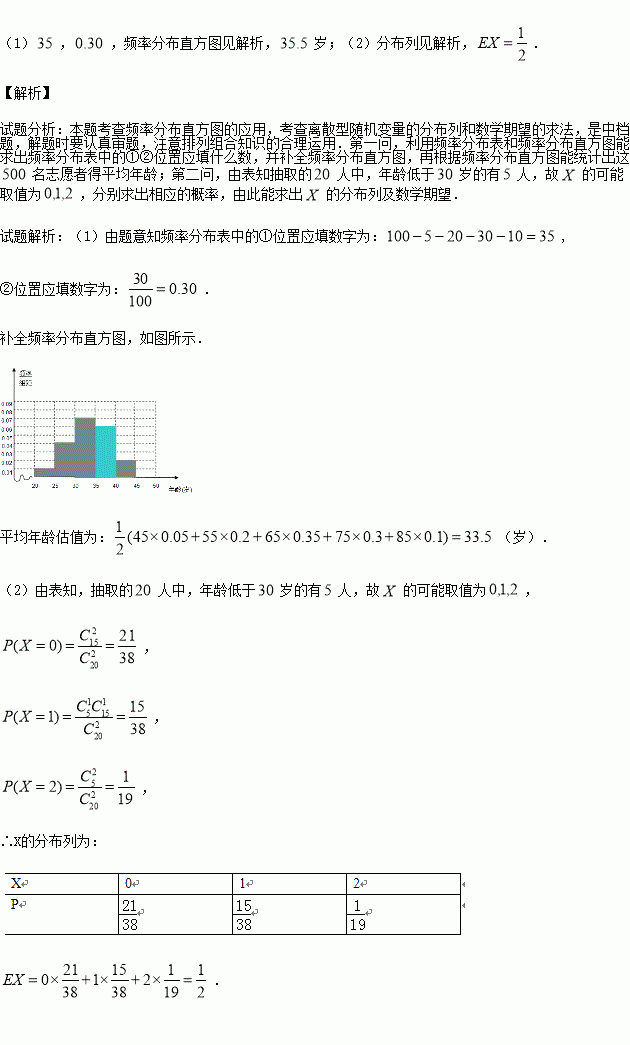 £¨2£©ÔÚ³é³öµÄ100ÃûÖ¾Ô¸ÕßÖа´ÄêÁä²ÉÓ÷ֲã³éÑùµÄ·½·¨³éÈ¡20Ãû²Î¼ÓµÄÐû´«»î¶¯£¬ÔÙ´ÓÕâ20ÃûÖÐѡȡ2ÃûÖ¾Ô¸Õßµ£ÈÎÖ÷Òª·¢ÑÔÈË£®¼ÇÕâ2ÃûÖ¾Ô¸ÕßÖС°ÄêÁäµÍÓÚ30ËꡱµÄÈËÊýΪX£¬ÇóXµÄ·Ö²¼Áм°ÊýѧÆÚÍû£®