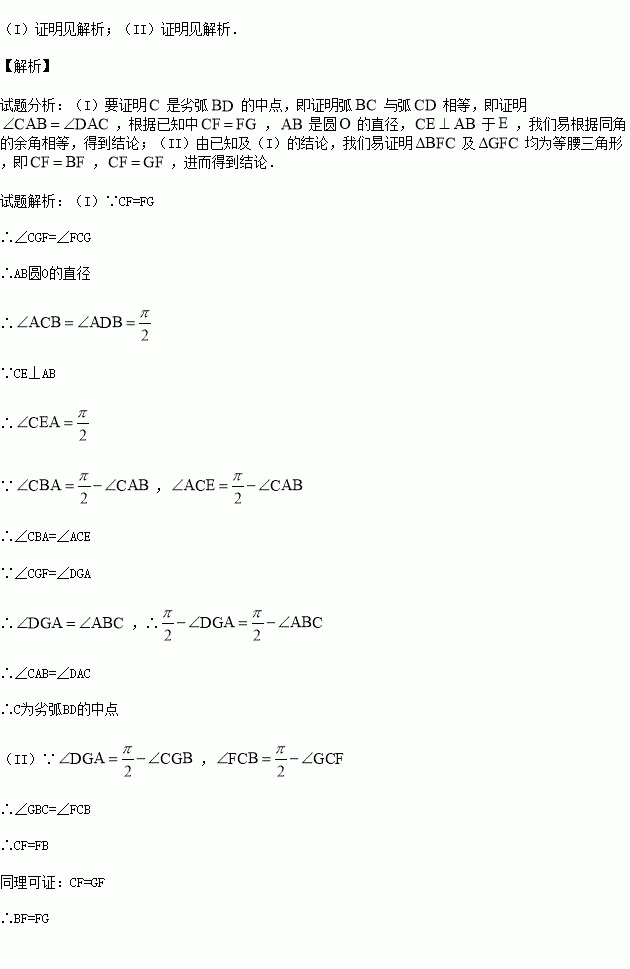 如图,已知AB是圆O的直径,C、D是圆O上的两个点,CE⊥AB于E,BD交AC于G,交CE于F,CF=FG.