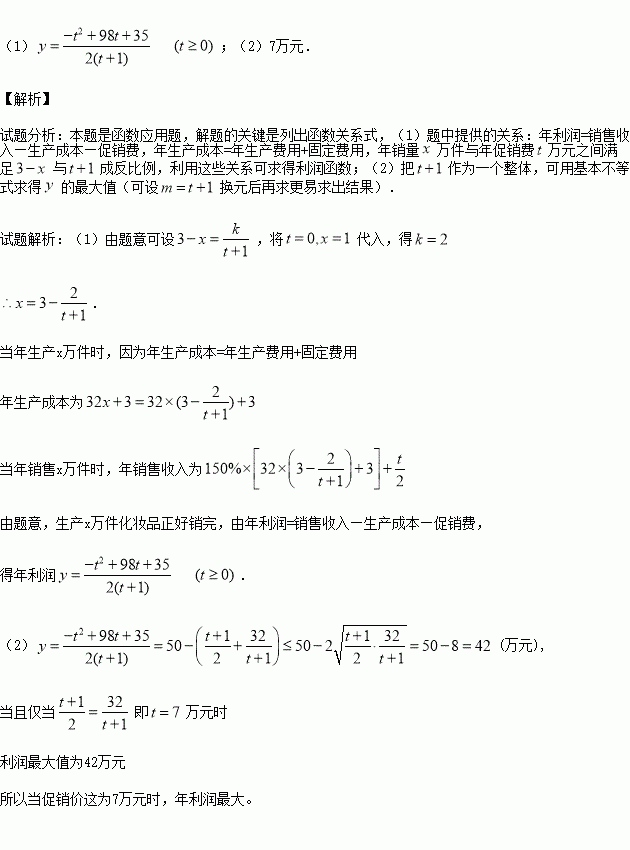 成反比例,如果不搞促销活动,化妆品的年销量只能是1万件,已知2016年生产化妆品的设备折旧,维修等固定费用为3万元,每生产1万件化妆品需再投入32万元的生产费用,若将每件化妆品的售价定为其生产成本的150%与平均每件促销费的一半的和,则当年生产的化妆品正好能销完。